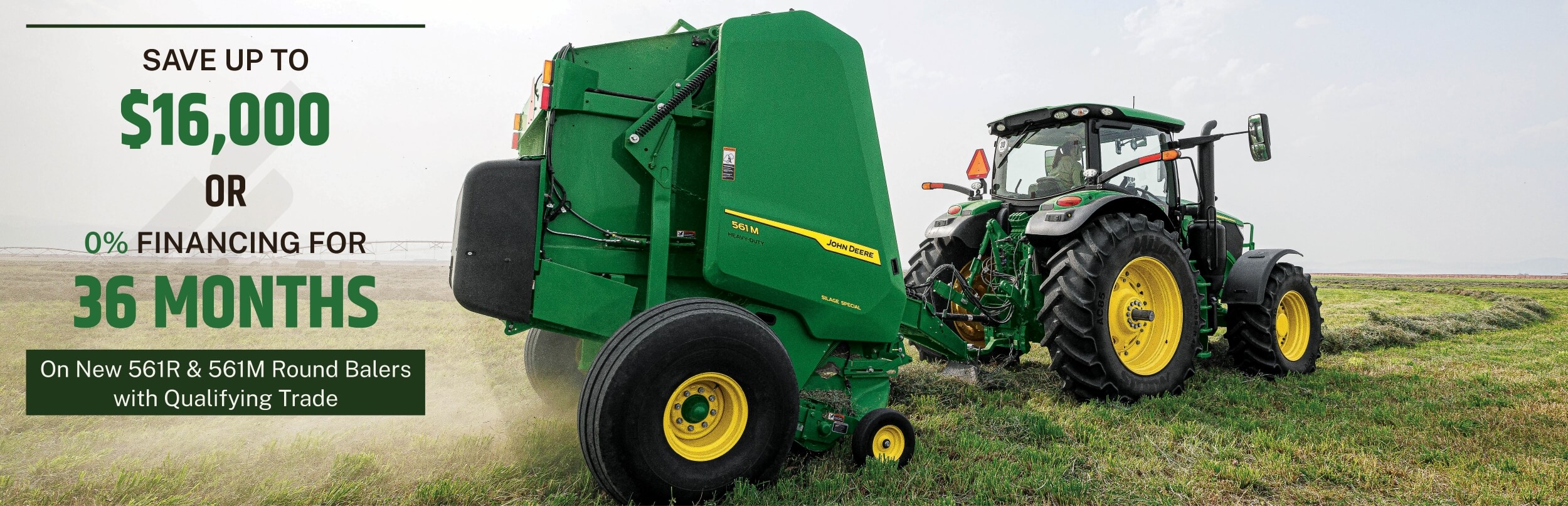 *Cash discount based on 561R round baler with pre-cutter. financing is subject to approval through John Deere Financial.Financing offers may require a financing fee. Some restrictions apply. In-Stock Units Only. See dealer for details. Offers end October 31, 2025