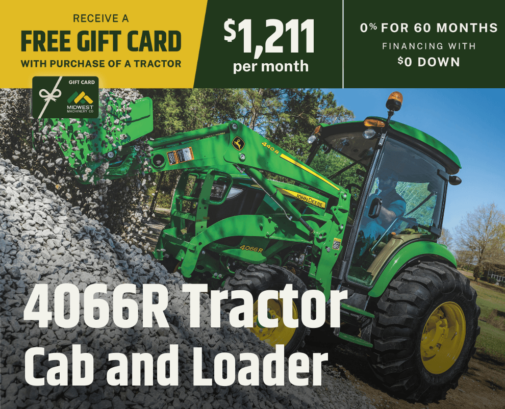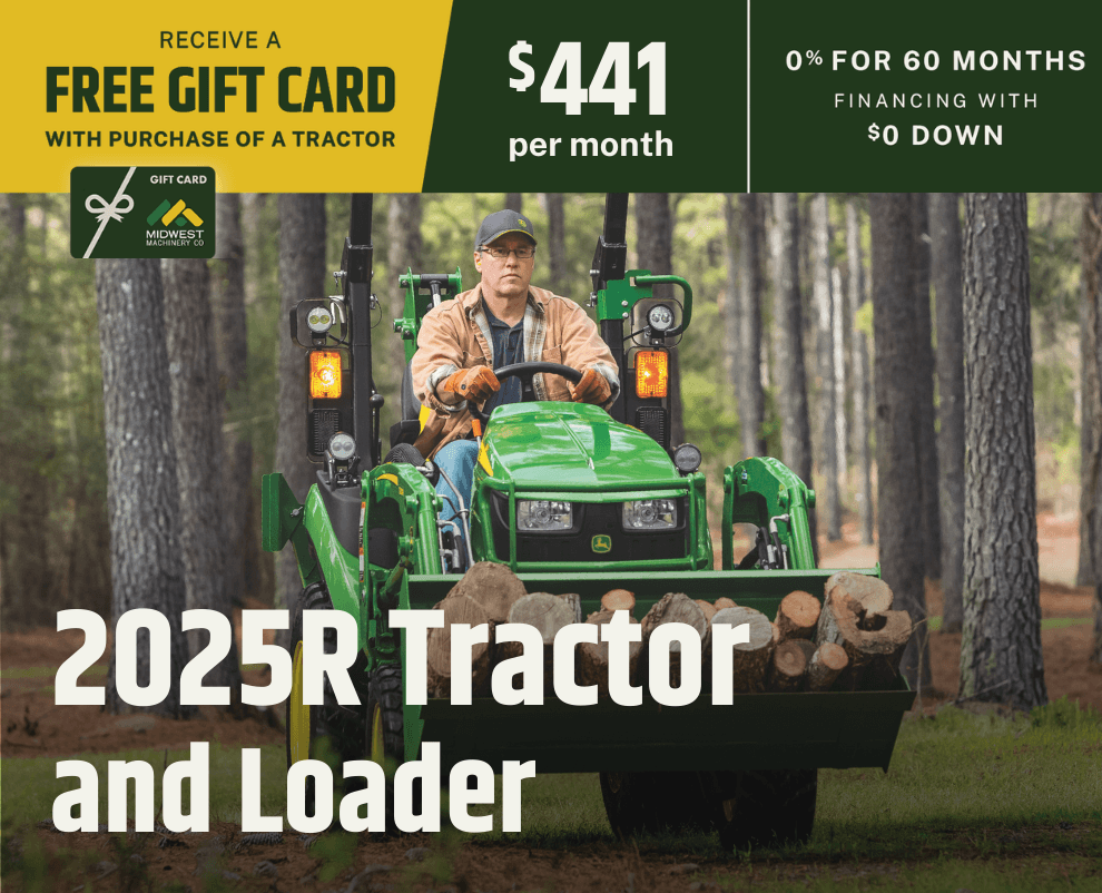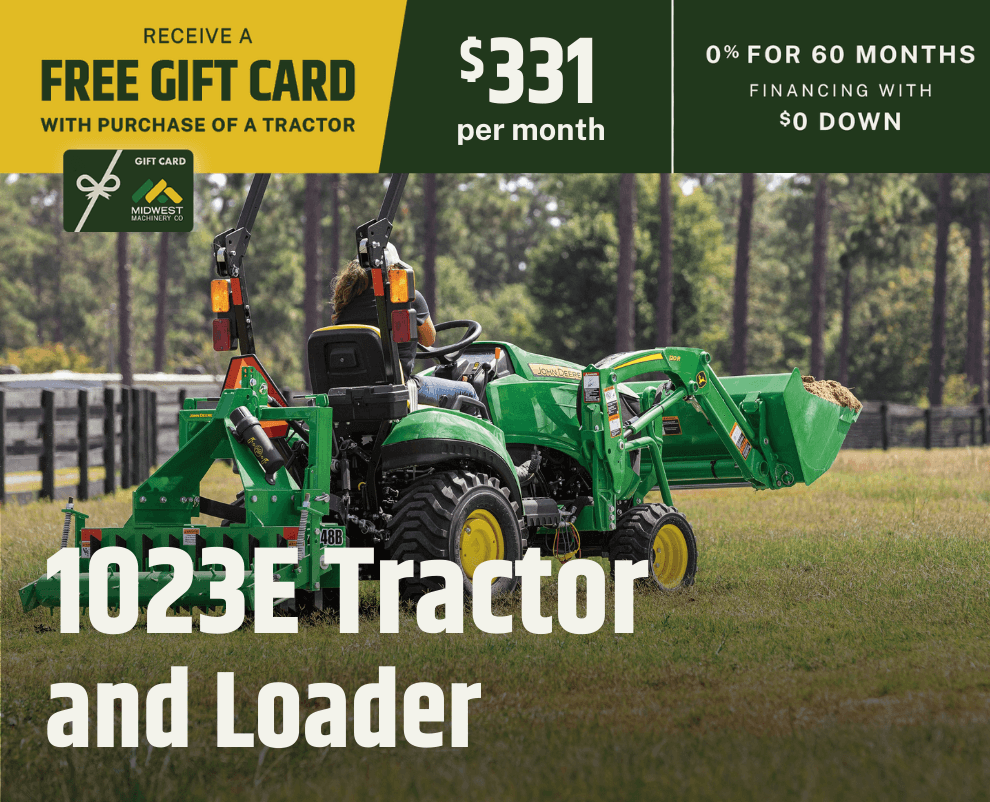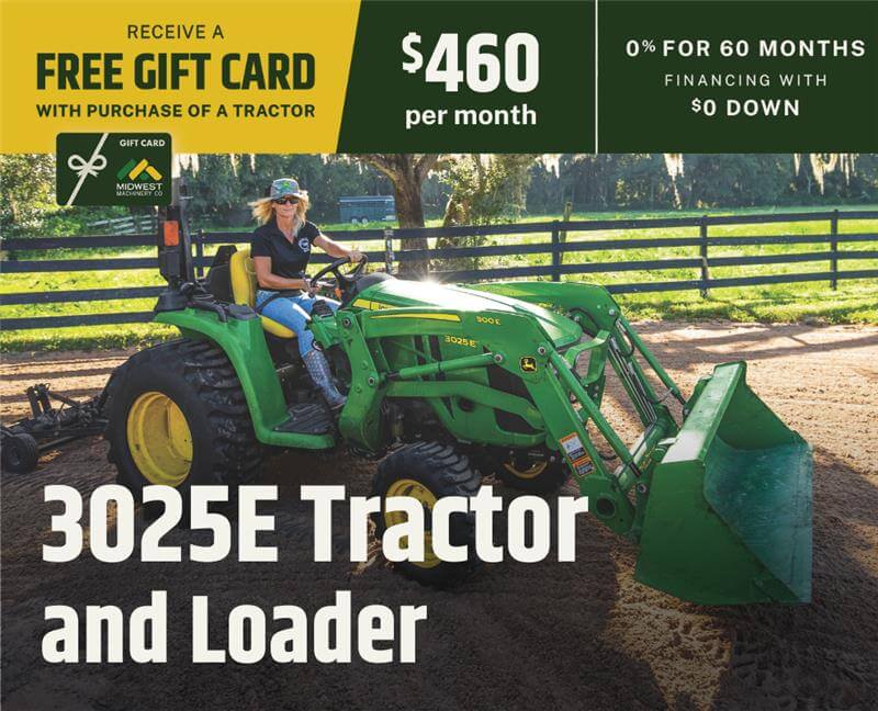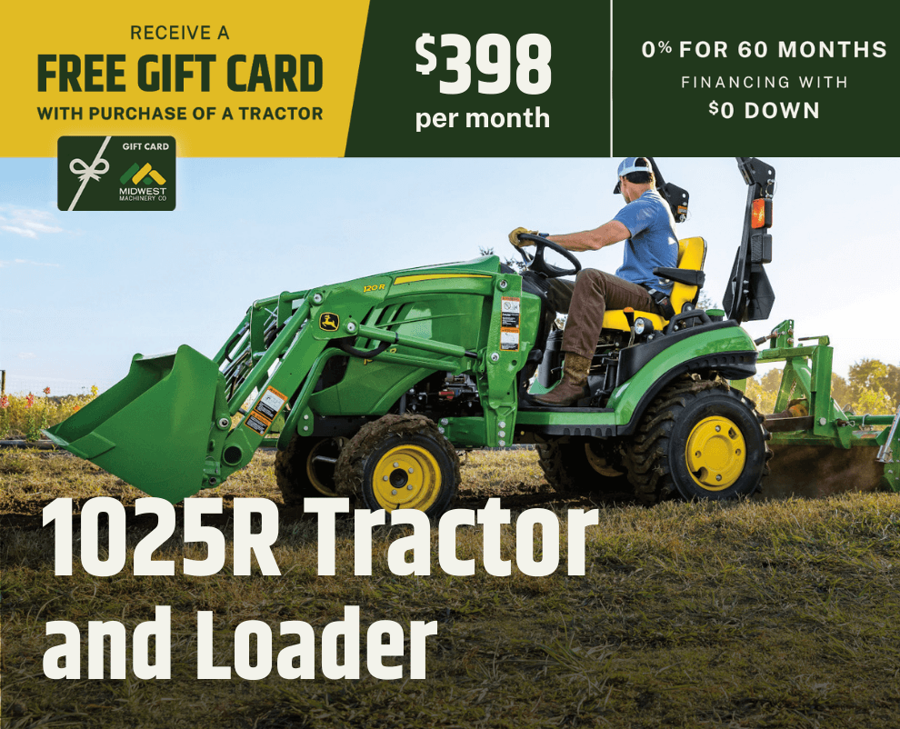 For a limited time, when you purchase a new John Deere Compact Tractor, you'll receive 0% financing for 60 months with $0 down, plus a Midwest Machinery gift card based on the tractor series you choose.